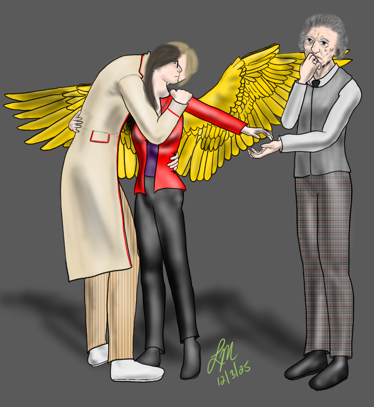What's My Name -- [1/27/25] -- At some point in "In the Quiet After", AL is going to confront Poul's boss (depicted here as a Danganronpa antagonist because I don't think I have any media where the individual is described) about the poor quality of care Poul received (or didn't receive...) after returning from the sandminer attack in "Robots of Death" and the fact that the Company covered everything up. I'm not sure if her wings are going to be visible in this scene as I haven't written it yet so here's the version with her wings transparent (ie invisible). The title of the image and AL's line comes from "What's My Name (Red Version)" from Descendants: The Rise of Red. It's a bop.