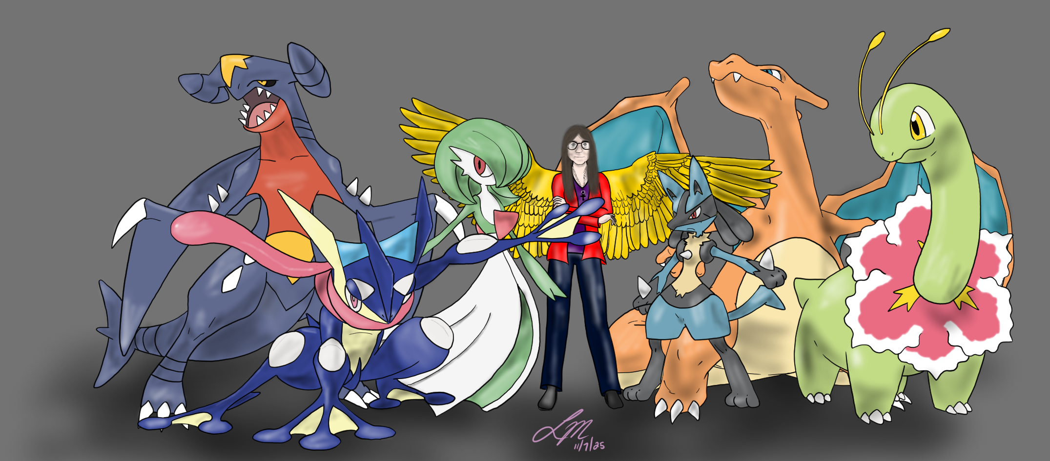 Pokémon Legends Z-A Team -- [11/7/25] -- I decided to draw AL with my team in Pokémon Legends Z-A. Casey the Meganium, Unno the Garchomp, Dragonfire the Charizard, Syrinx the Gardevoir, Riolouie the Lucario (in-game trade; came with the name), and Parkour the Greninja. All male except Syrinx; all able to Mega Evolve.