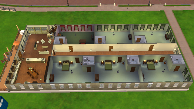 What is affectionately called the Hall O'Rooms, that houses all of the bedrooms for anyone when they stay on Alnilam. The Sims lots limit it to six rooms, but this can go on forever if, by whatever chance, all of Lisa's romantic partners just happen to be on the planet and need a place to stay. Or anyone who needs a room, really.
